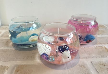 カラフルな砂やキャンドルを使って作るアロマジェルキャンドルを2個作ります。